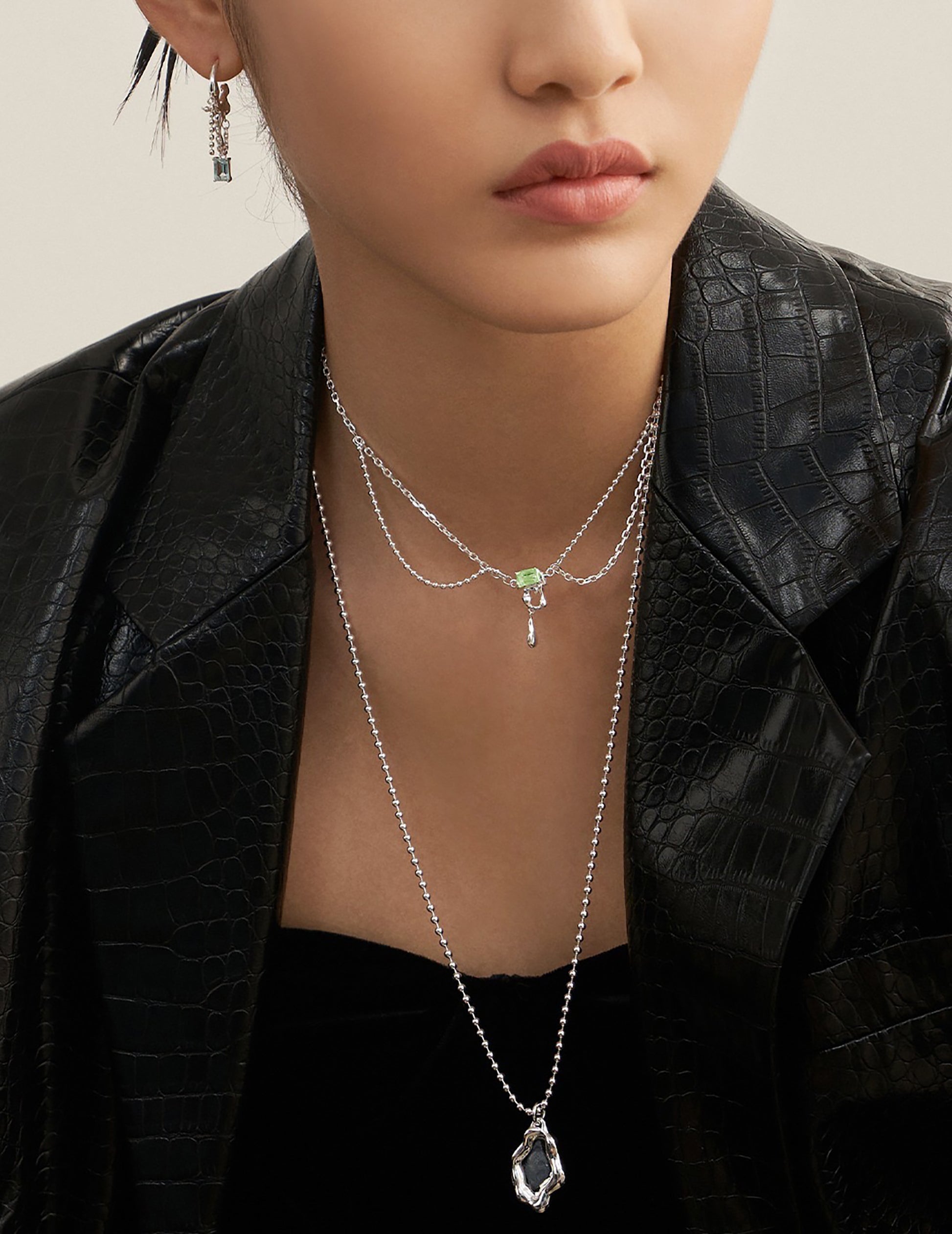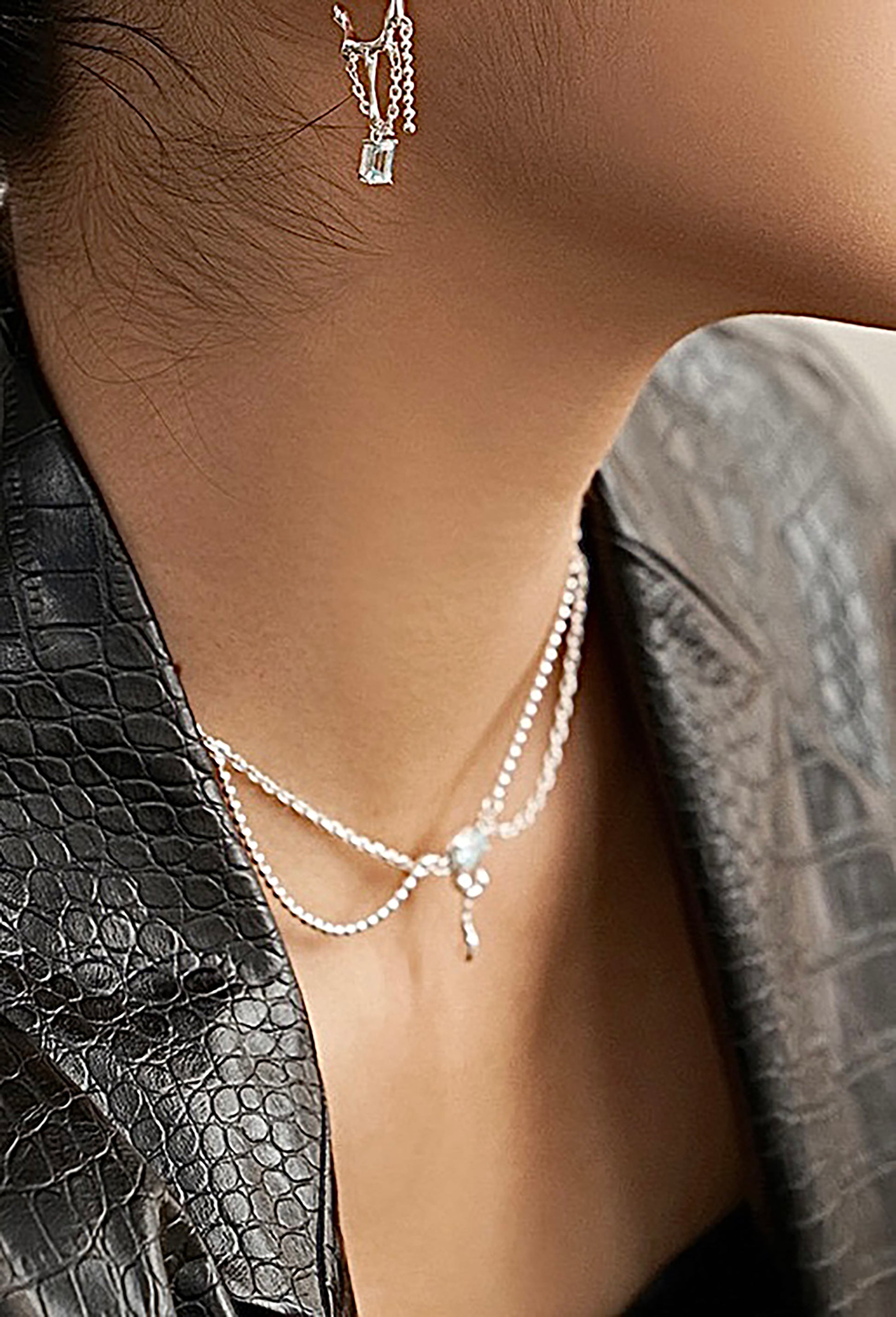 Introducing our double-layered necklace, made of 925 sterling silver and featuring a stunning topaz stone pendant. The necklace is inspired by the flowing movement of water, with the liquid flow of water being frozen in time. The high-quality topaz stone adds elegance and sophistication to the design, making it a perfect accessory for any occasion. The simple yet unique design sets it apart from other necklaces, making it a statement piece that is sure to turn heads. Elevate your style with this stunning and distinctive 925 sterling silver double-layered necklace today!