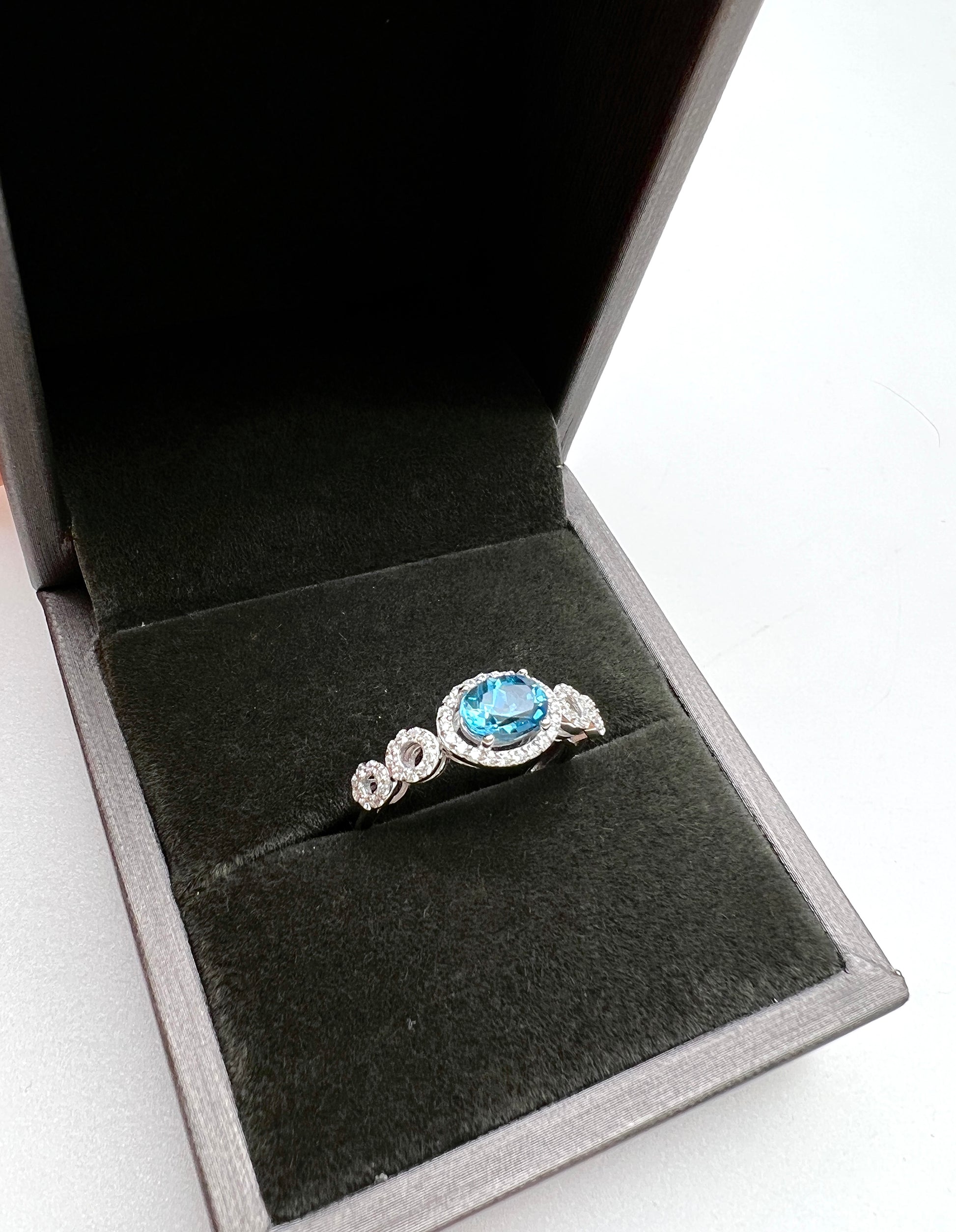 This ring features a beautiful topaz stone at the center, surrounded by small, delicate diamonds in a stunning and intricate design. Topaz is known for its beautiful sea-blue color and unique cut, making it a popular gemstone choice that adds a touch of elegance and charm to your finger.