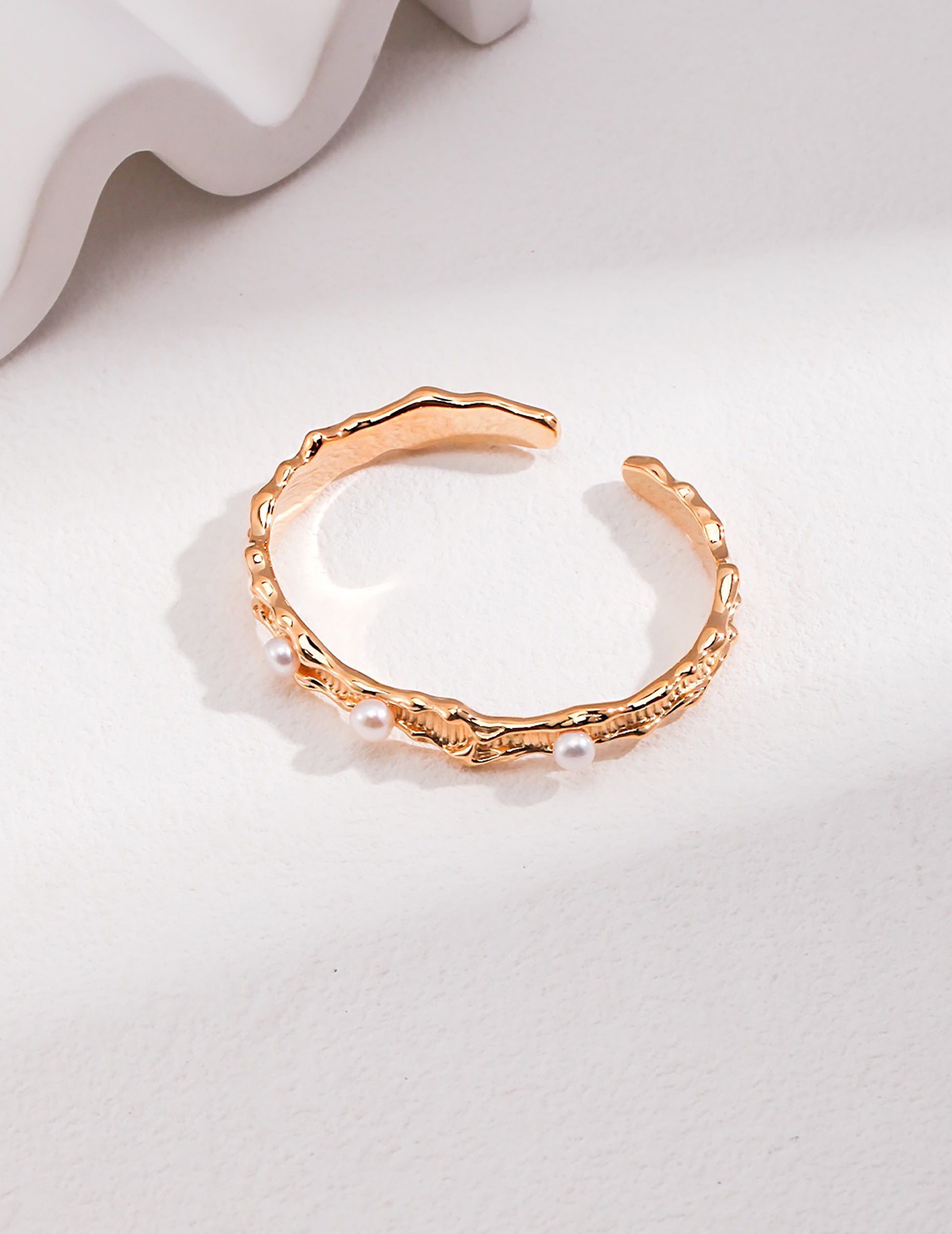 Wave Shaped Gold With Pearls Open Bangle
